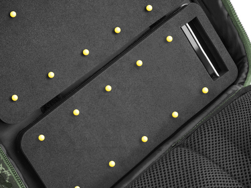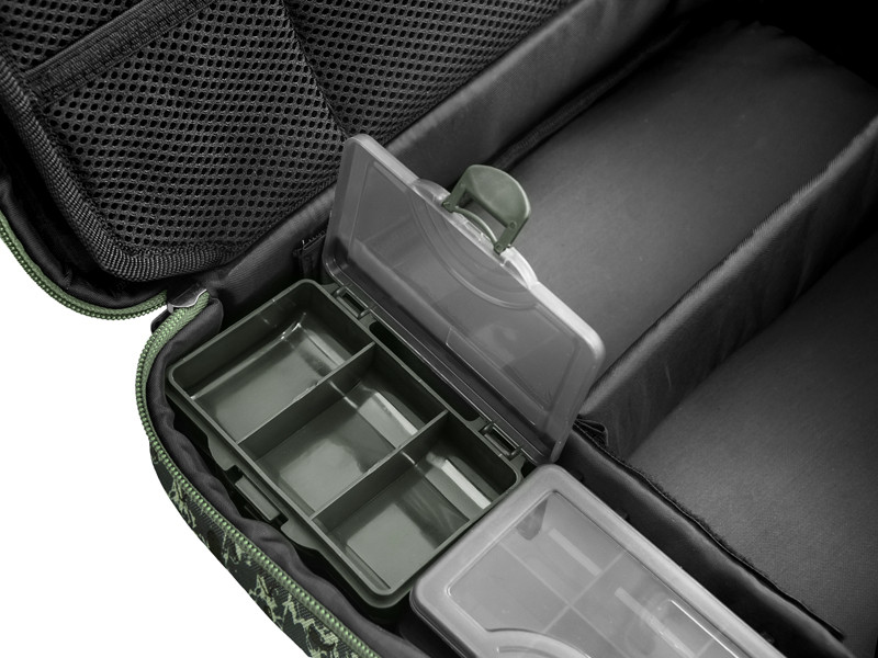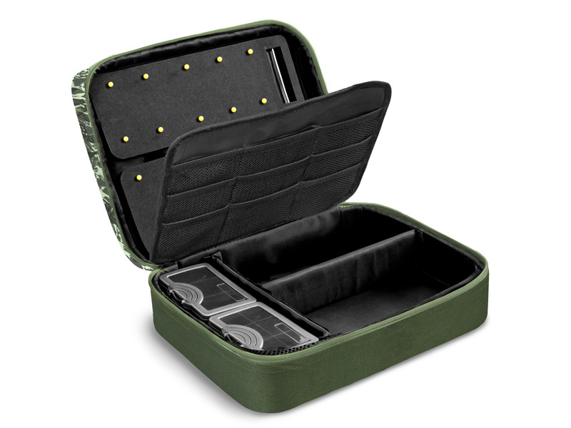 В основному відділенні достатньо місця для зберігання різних дрібничок, шнурів та інструментів, необхідних для зв’язування снастей. Крім того, він містить 4 практичні коробки, в яких ваші дрібнички завжди в цілості та безпеці. Центральна панель оснащена дрібною сіткою з одного боку та великою сітчастою кишенею з іншого боку. Завдяки такій конструкції ви завжди можете подивитися, що знаходиться всередині, та без проблем знайти необхідне обладнання. RigStation також включає дві поверхні з піноматеріалу для ідеального розташування і кріплення ваших готових оснасток.