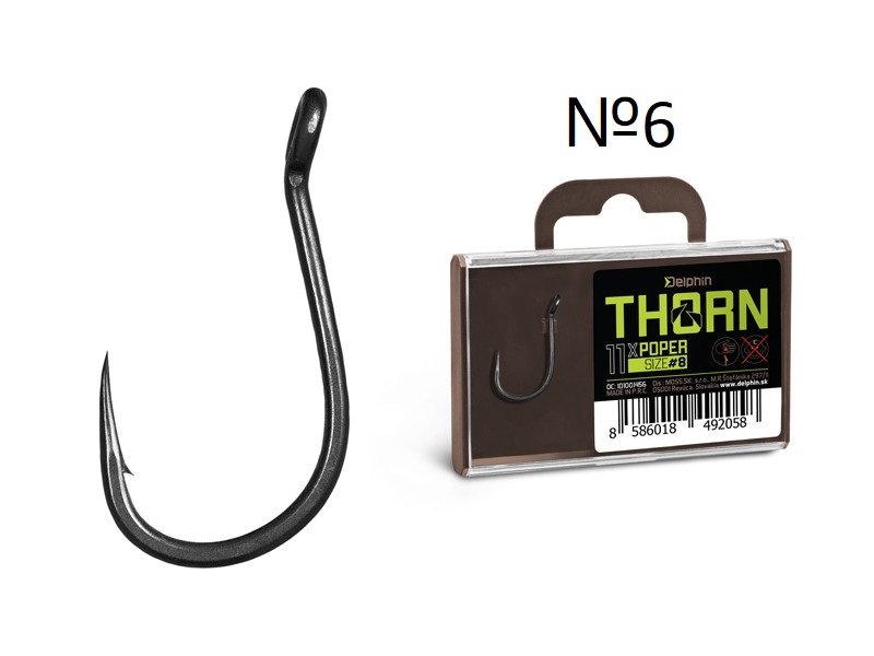 Гачки Delphin THORN Poper– преміальна лінійка коропових гачків найвищої якості. Завдяки сучасним технологіям, використаним у виробництві, ці гачки є синонімом безкомпромісної міцності та максимальної гостроти. Гачки мають титанову обробку поверхні, яка надає їм матово-сіру поверхню, ідеально гладку для легкого проникнення в губу коропа. TitanX піклується про посилення та довговічність всього гачка.