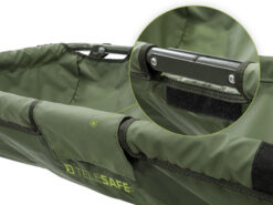 Люлька дуже міцна, оскільки під час екстремальних випробувань вона змогла витримати до 75 кг статичної ваги! На обох кінцях є сітчаста тканина для відводу зайвої води. TeleSAFE також має кришку, прикріплену блискавкою-липучкою. Це дозволяє безпечно тримати рибу всередині, поки ви готуєте камеру або приносите воду, щоб полити нею рибу. Телескопічні грязьові ніжки не дозволять люльці загрузнути в бруді. Ще однією сильною стороною цього продукту є легкість транспортування. Конструкція розділена посередині, тому її дуже легко скласти навпіл і носити з собою.