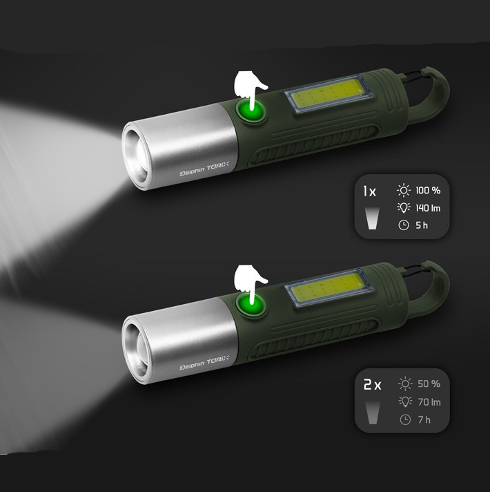Delphin Torix – це практичний акумуляторний ліхтарик універсального використання. Ви можете використовувати його як класичний ліхтарик, ліхтарик для намету або як надійного помічника для нічного закидання – особливо завдяки функції ZOOM, яка дозволяє регулювати ширину світлового конуса саме так, як потрібно.