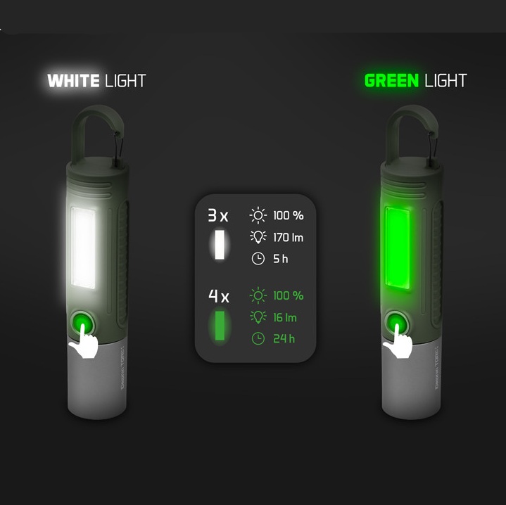 Перше натискання активує основний діод з функцією ZOOM та 100% інтенсивністю світла (140 люменів), тоді як час роботи від батареї в цьому режимі становить приблизно 5 годин. Друге натискання зменшує інтенсивність світла до 50% (70 люменів). Третє натискання вмикає другий діод з білим світлом та повною інтенсивністю 170 люменів, при якому ліхтарик може працювати приблизно 5 годин. Четверте натискання активує зелене світло, ідеально підходить, наприклад, як позиційний ліхтарик – його заряда вистачить на 24 години.