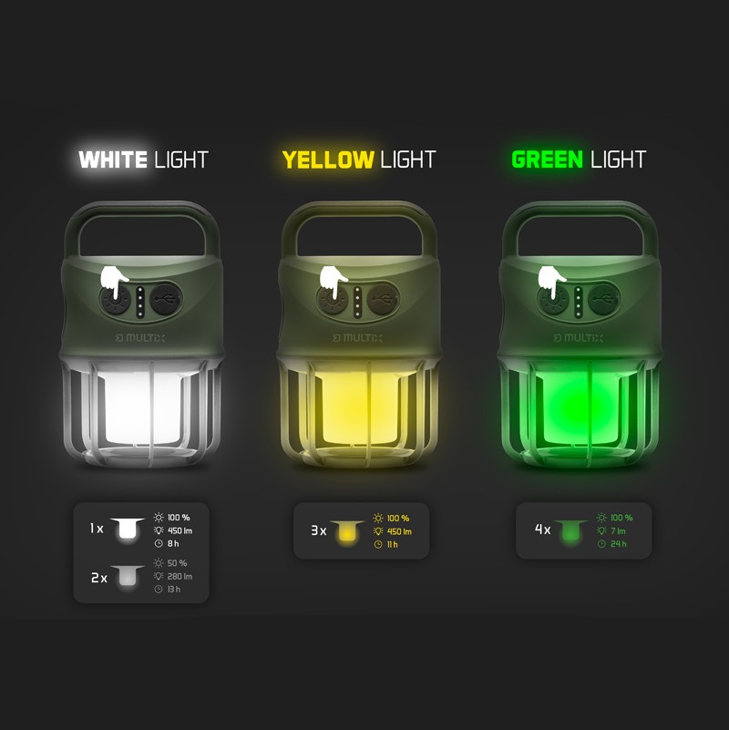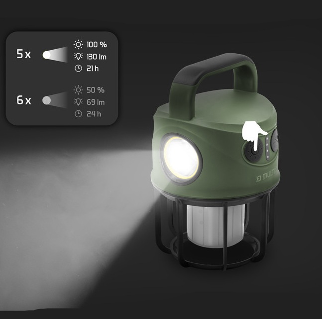 Delphin MULTiX – це практичний акумуляторний кемпінговий ліхтар, який поєднує в собі високу світловіддачу, тривалий термін служби батареї та міцну конструкцію. Завдяки порту USB-A ліхтар також можна використовувати як зовнішній акумулятор.