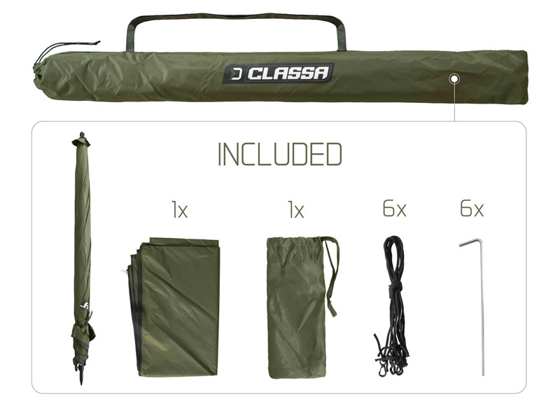 Шви парасольки повністю проклеєні водонепроникною стрічкою, щоб забезпечити 100% водонепроникність навіть під сильним дощем. Для кращої стійкості на вітрі парасолька CLASSA оснащена шістьма анкерними мотузками. Є бічна розширена стінка, яка застібається на високоякісну блискавку навколо купола. Нижня частина оснащена петлями для кріплення до землі за допомогою фіксаторів (кілочки входять до комплекту).