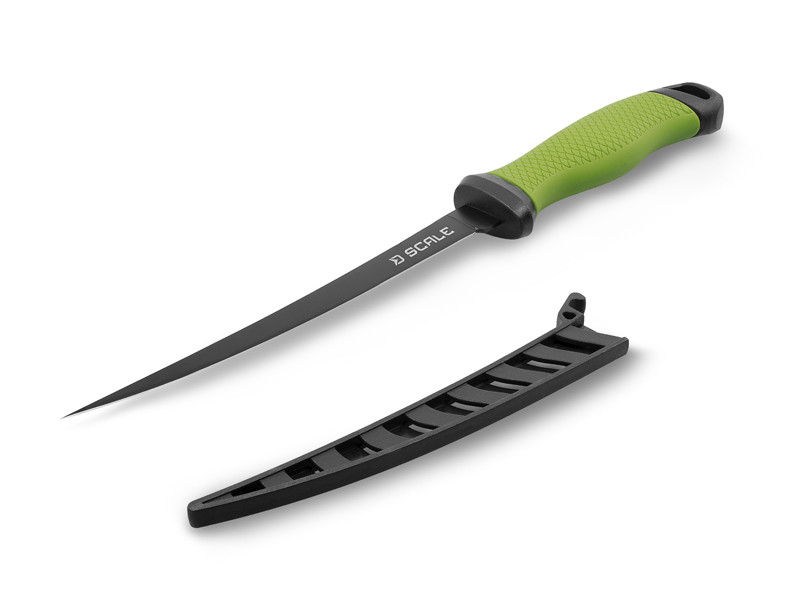 Ніж оснащений м’якою і дуже приємною ергономічною рукояткою з протиковзкою поверхнею, яка також нагадує за формою луску, що, безсумнівно, сподобається багатьом рибалкам. Лезо захищене захисним пластиковим футляром для безпечного зберігання та транспортування.