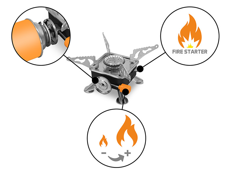 Плита сумісна з бутановими картриджами вагою 220 г (400 мл) з швидкознімним клапаном, які виготовлені відповідно до стандарту EN417. Досить притиснути картриджний клапан до затискного механізму на плиті в правильному положенні, злегка повернути його і вузол готовий до використання. Він оснащений ротаційним регулюванням потоку газу і п’єзоелектричним підпалом, завдяки чому вам не знадобляться сірники або запальничка.