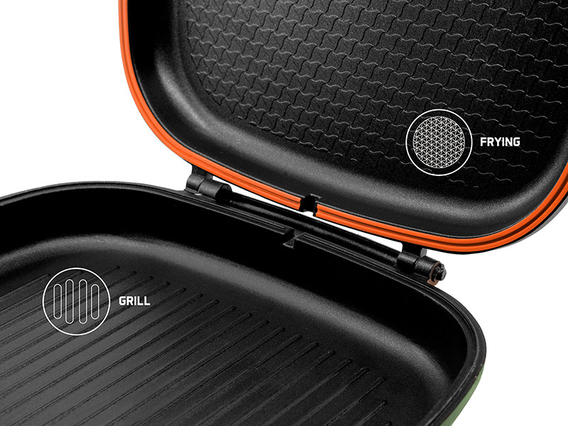 Завдяки магніту на ручці, окремі половинки ідеально з’єднуються після закриття, і ви можете повертати пательню як завгодно під час приготування їжі. Стійке до високих температур периферійне ущільнення забезпечує ідеальну герметичність. Безсумнівно, найбільшою перевагою закритої сковорідки є те, що тепло накопичується всередині набагато швидше і не виходить з неї під час приготування. Завдяки цьому готувати їжу на природі набагато швидше і легше.