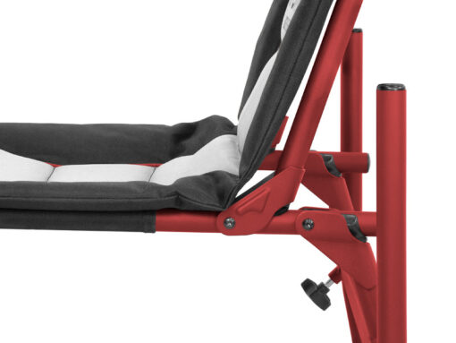 Передня пара ніг в порівнянні з задньою має значне подовження труб. Це рішення не звичайне, але абсолютно функціональна деталь. Завдяки довшій ніжці на цьому профілі можна розмістити більше елементів, а така конструкція надає кріслу набагато більшої варіативності. У той же час, все буде під рукою. Усі чотири ніжки висувні, а також забезпечені високоякісними шарнірними п’ятами із твердого пластику. Завдяки цьому крісло може розкладатися навіть на нерівній місцевості. Крім того, широкі п’яти запобігають зануренню стільця в землю у разі більш м’якої поверхні. При проектуванні ми також подумали про стійкість крісла, тому до передньої пари ніжок додали фіксуючий механізм, що запобігає нахилу і подальше перекидання крісла при використанні великих і важких тримачів. Максимальний комфорт, продуманість та над стійкість – це крісло Delphin ATOMA RaceBase!