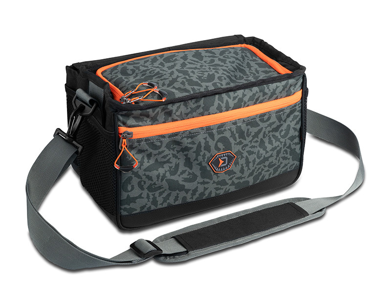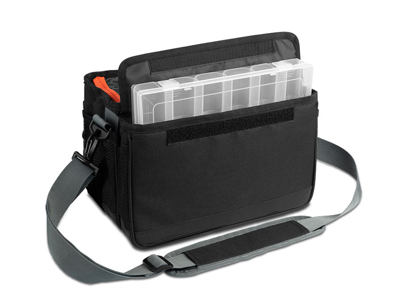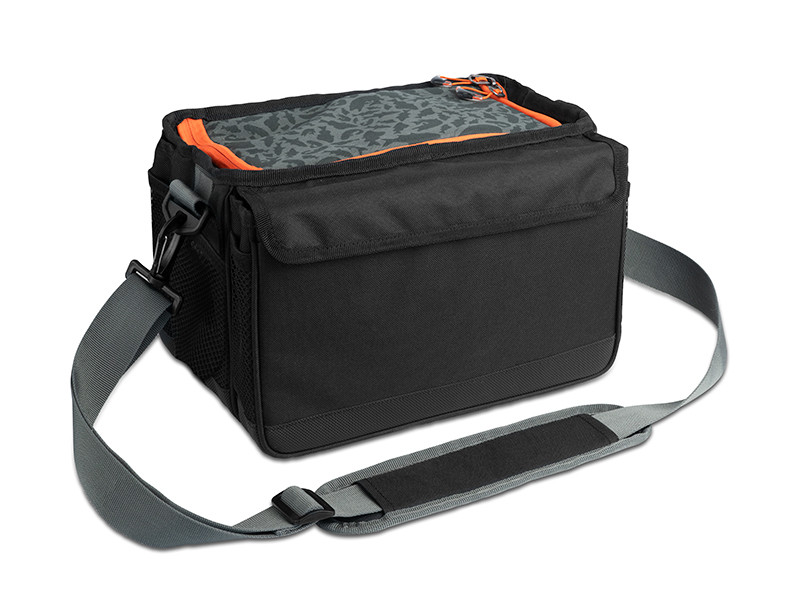 Ми розробили сумку таким чином, щоб усі місця для зберігання були легко доступні для рибалки, навіть якщо вони носять її під час риболовлі. Тому ми розробили внутрішню кришку таким чином, щоб її можна було відкрити в напрямку рибалки. Внутрішній простір можна розділити перегородкою на липучці, а також налаштувати відповідно до ваших потреб. З обох сторін є розділена сітчаста кишеня, в якій можна зберігати дрібниці. Ззаду розташована кишеня на липучці, в якій знаходиться одна пластикова коробка зі знімними перегородками. Короб є частиною сумки і оснащений знімними внутрішніми перегородками. Спереду також є кишеня на блискавці, яку можна використовувати, для зберігання документів, або іншого дріб’язку.