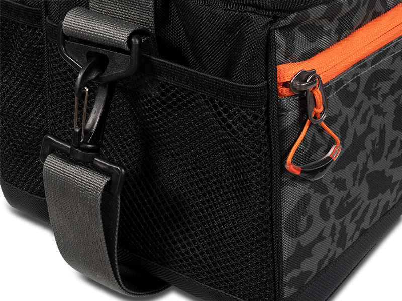 Якісні помаранчеві зовнішні блискавки оснащені пластиковим знімачем на помаранчевій мотузці, який розширений на кінці, тому його можна швидко захопити. Помаранчева фурнітура дозволяє рибалці зробити сумку добре помітною навіть в темряві і відразу її знайти. Сумка виготовлена з легкої, але міцної тканини чорного кольору. Вона оснащена плечовим ременем чорного кольору. Дизайн сумки доповнює наш унікальний темний Darx ATAK! камуфляж із силуетами хижих риб.