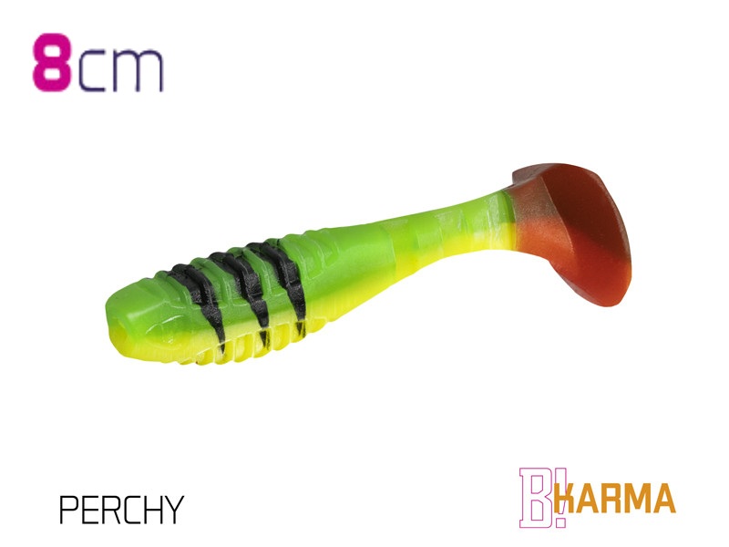 З самого початку ми сприйняли дизайн моделі KARMA як некласичне рішення класичної моделі. Метою було створити приманку з широким спектром використання, але по-своєму. З першого погляду можна помітити, що співвідношення розмірів тіла і хвоста приманки інше, ніж зазвичай. Більший хвіст приманки викликає нетиповий рух приманки, який, окрім коливання хвоста, додає ще й м’яке перекочування тіла, що створює враження вразливої здобичі. Цей рух надзвичайно привабливий для риби та дає вам нові можливості в роботі з наживкою. Між з’єднанням тіла приманки і хвоста моделюються три виїмки, які додають правдоподібності дії приманки. Тіло самої приманки оснащене поглибленнями на спині і черевці. На це є дві причини. По-перше, це посилення вібрацій у воді. Друга причина — полегшити оснащення приманки гачком. За допомогою насічок можна виміряти, де саме гачок буде виходити з приманки. Передня частина приманки в районі голови, модифікована вирізом для кращого прилягання приманки до джиг-головки.