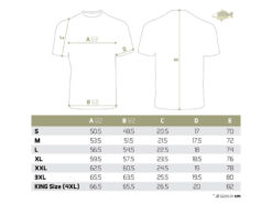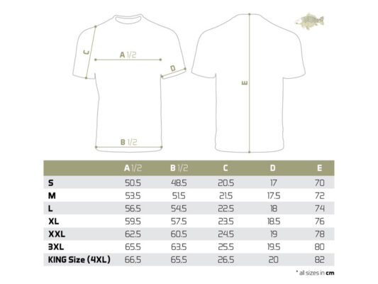 Сама футболка високої якості, як і принт, використаний на поліграфії. Ми пропонуємо їх у широкому діапазоні розмірів від S до KING SIZE (еквівалент 4 + XL, у більшості країн позначається як XXXXL. Модель King size легко одягне навіть найбільший рибалка вагою 135 кг +.