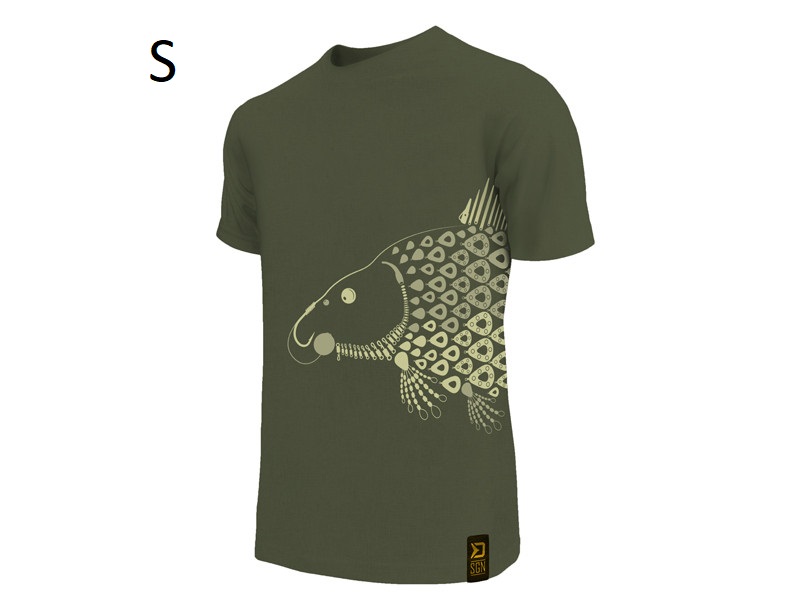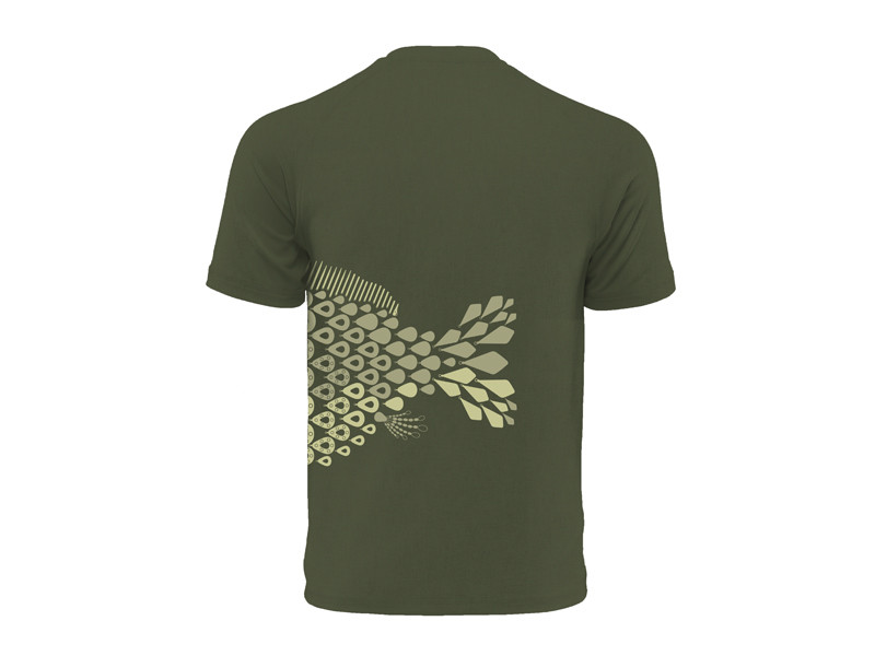 Вона виготовлена з темно-зеленого матеріалу, який ідеально вписується в природне середовище. Малюнок коропа, який зображений на футболці, повністю складається з окремих елементів монтажа, таких як вертлюжки, поводок, грузила тощо. Це робить Delphin TACKLE і справді унікальним предметом одягу.