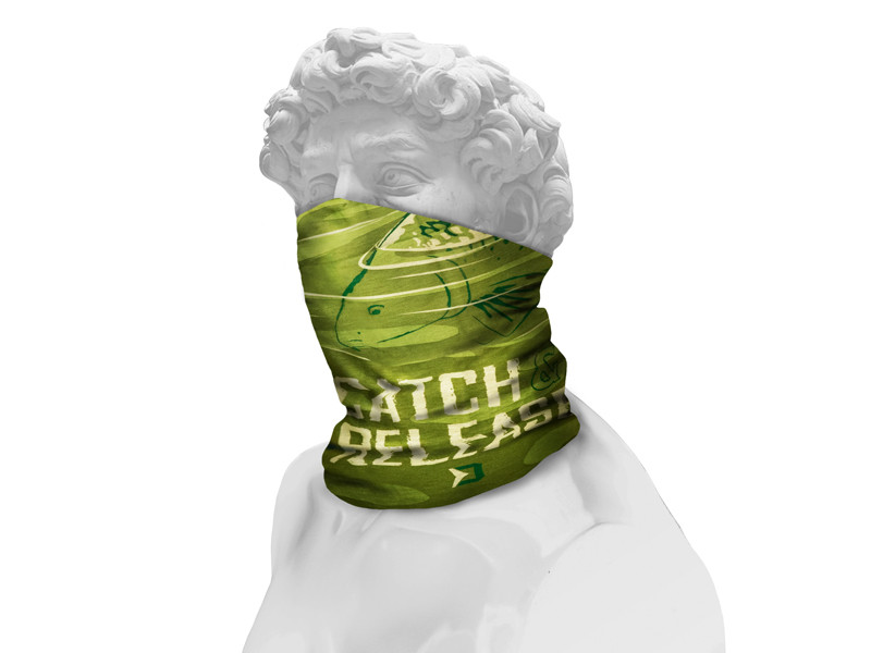 Багатофункціональна пов’язка на голову Delphin Catch and release | UNI з унікальним камуфляжним дизайном, що поєднує в собі елементи коропових оснасток з силуетами коропів.