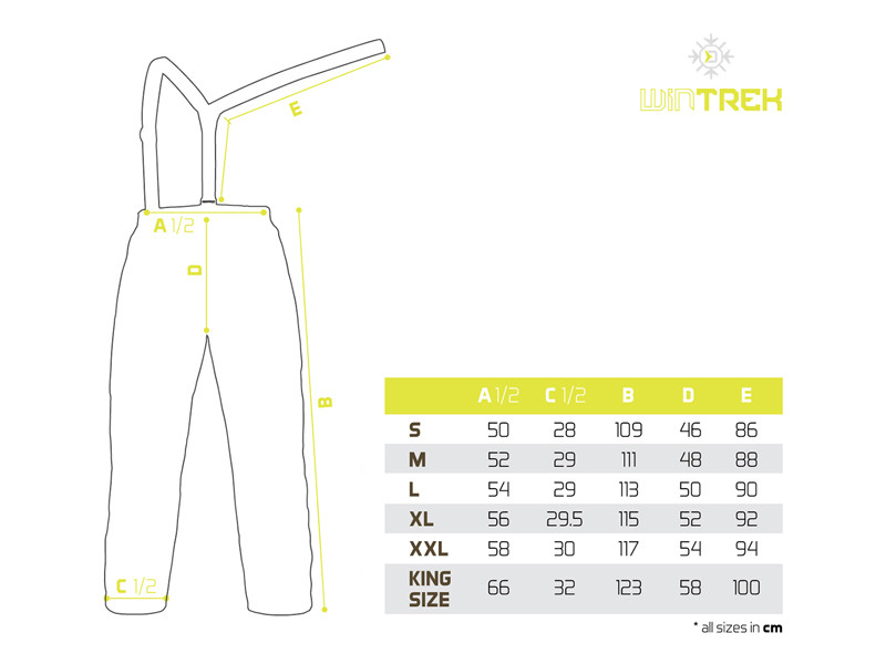Штани WinTREK також мають дві кишені на блискавці з обох сторін. Вони яскраво-жовті й покриті водонепроникною тканиною. Гумові підтяжки можна відрегулювати під свій зріст і повністю від’єднати за допомогою липучки. Лінія талії має еластичну стрічку для більшої гнучкості. Внутрішня підкладка виготовлена з м’якої стьобаної тканини для підвищення комфорту.
