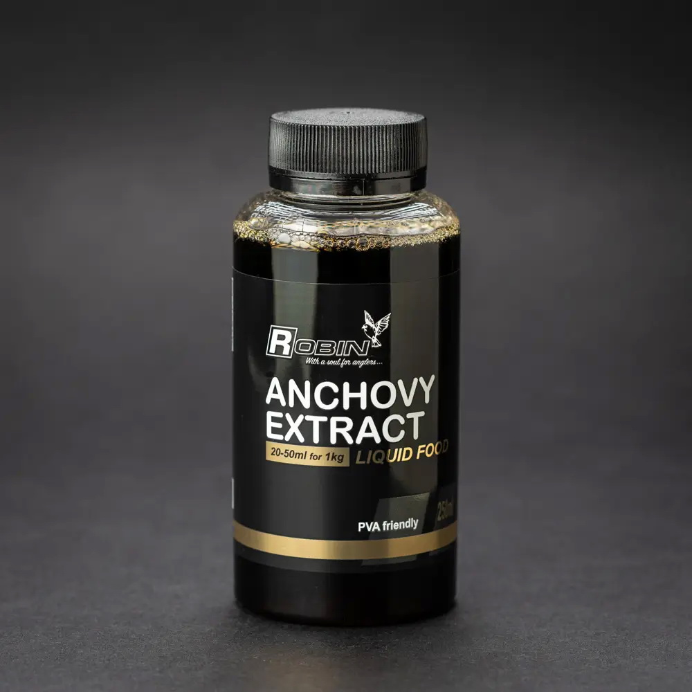 LIQUID ROBIN Anchovy Extract – Це екстракт анчоусу який має стійкий рибний аромат та підходить для зволоження та додавання атрактивності вашій короповій прикормці. Чудовим рішенням також буде діпувати ваш стік у даній рідині за для виділення вашої насадки на дні водойми.