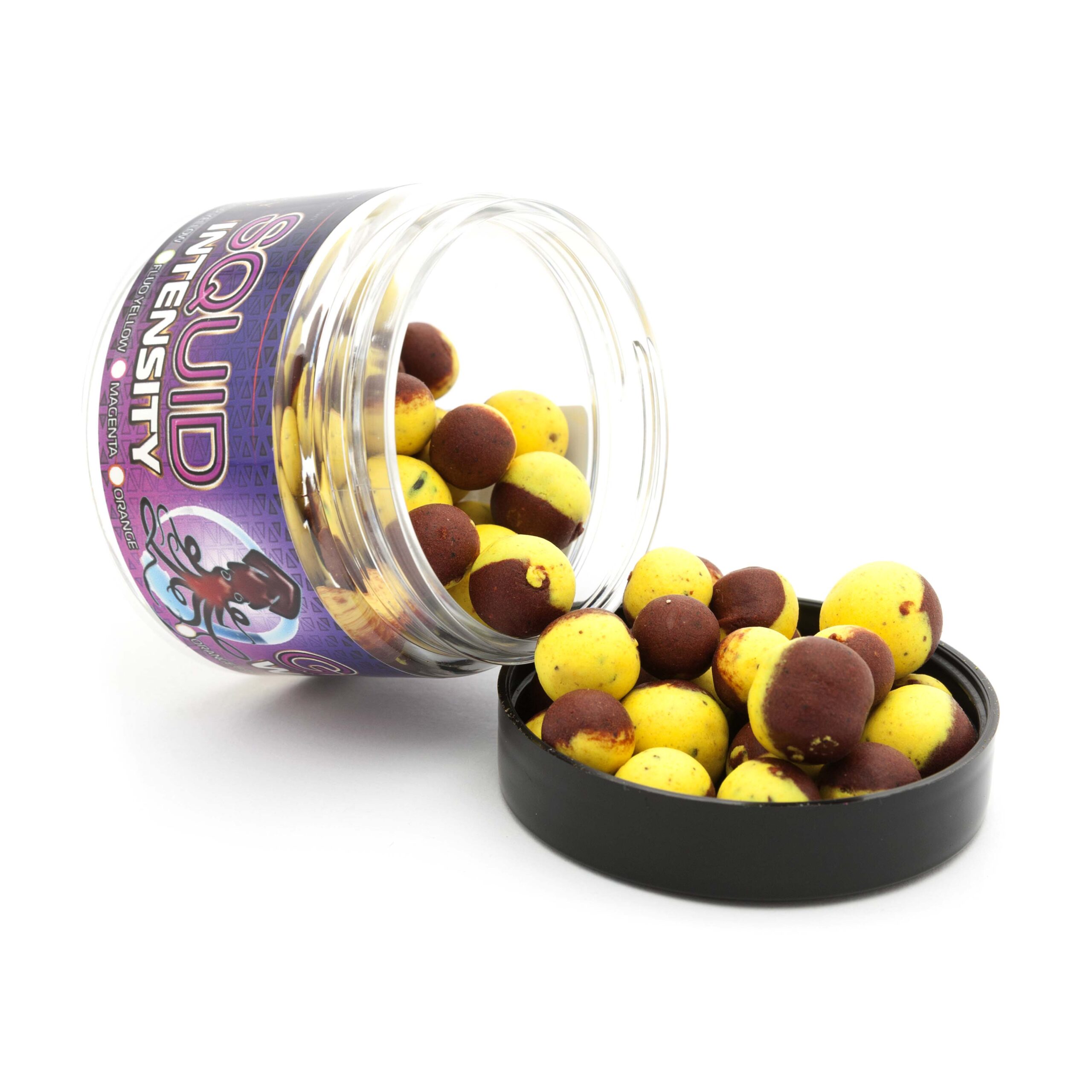 Серія вафтерсів SQUID GAME INTENSITY зроблено в основному для спорту. Ця серія – це десять топових кольорів верху вафтерса, які найчастіше використовуються, в залежності від умов. І фішка – це різна плавучість, наприклад у 14 мм менша а у 10 мм більша. В кожній баночці – три розміри: 10мм, 12мм, 14мм. (порада від виробника: менший розмір використовувати при поганому клюванні а більший коли кльов добрий).