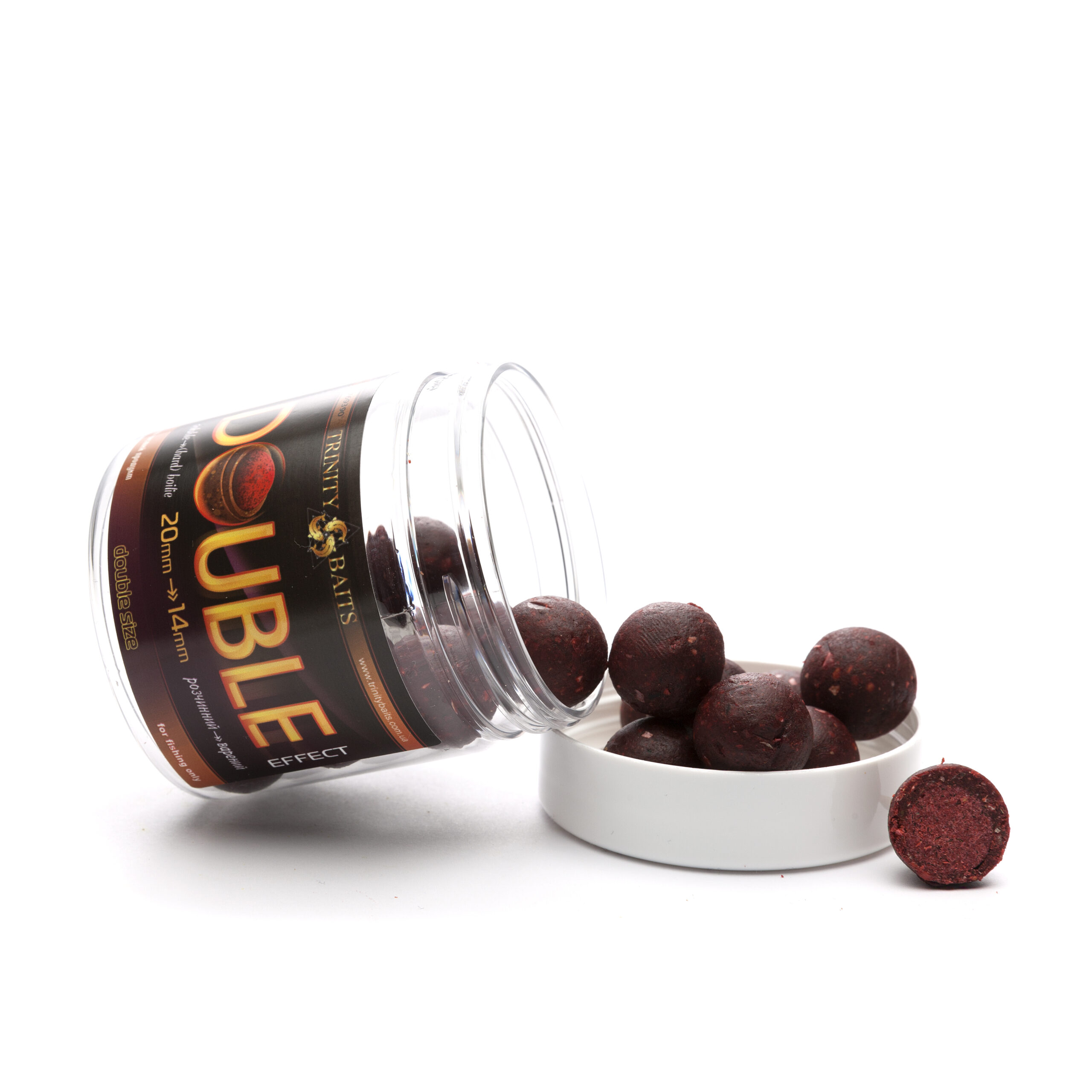 Бойли насадочні DOUBLE складаються з двох частин. В середині варений 14мм., який рівномірно обгорнутий розчинним до 20мм. Накатані на фірмовому міксі від Trinity Baits. Збалансований склад неодноразово доповнений і покращений. Бойли мають м’яку структуру, що дозволяє комфортно одягати їх на волосінь. При попаданні у воду починають блискавично подавати харчовий сигнал.