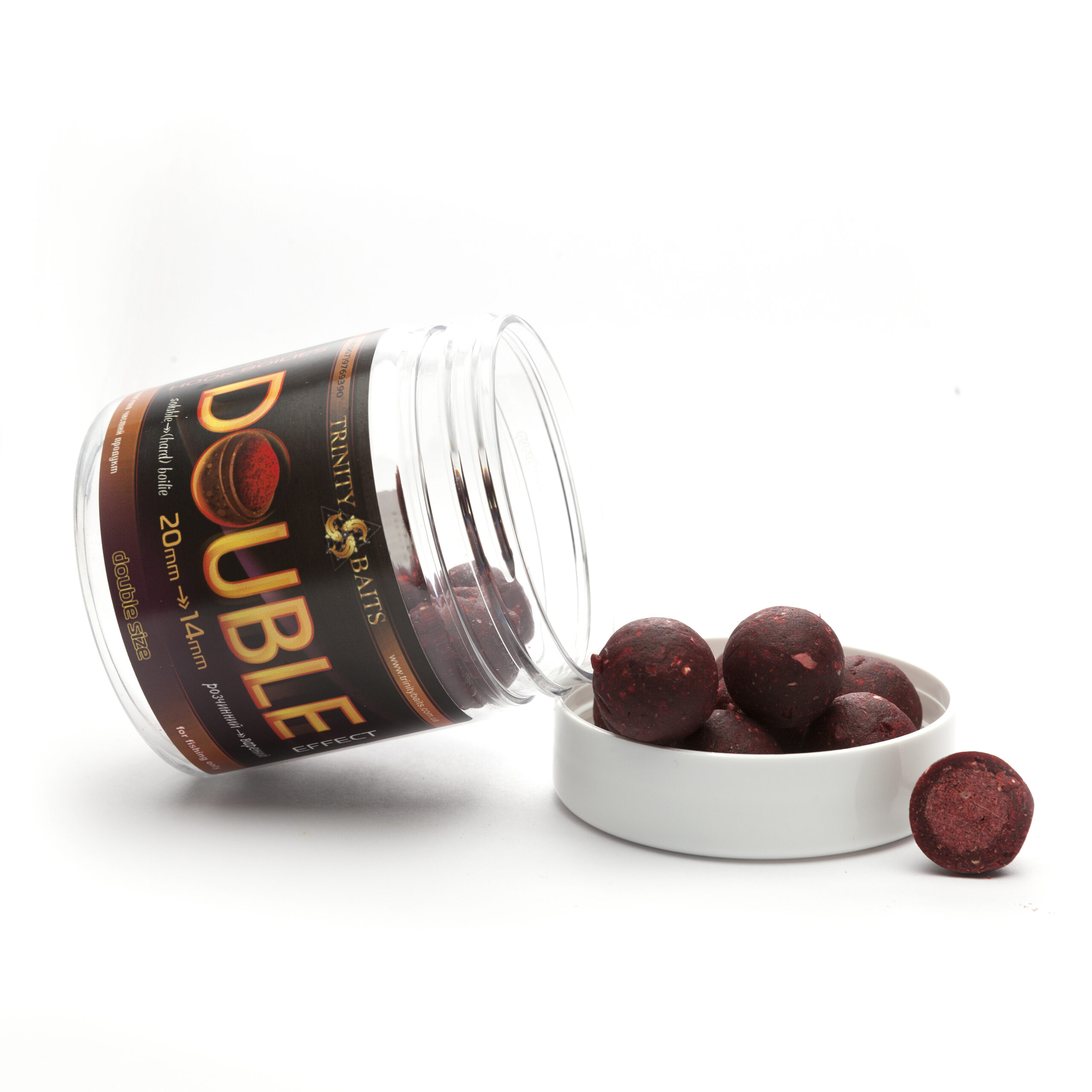 Бойли насадочні DOUBLE складаються з двох частин. В середині варений 14мм., який рівномірно обгорнутий розчинним до 20мм. Накатані на фірмовому міксі від Trinity Baits. Збалансований склад неодноразово доповнений і покращений. Бойли мають м’яку структуру, що дозволяє комфортно одягати їх на волосінь. При попаданні у воду починають блискавично подавати харчовий сигнал.