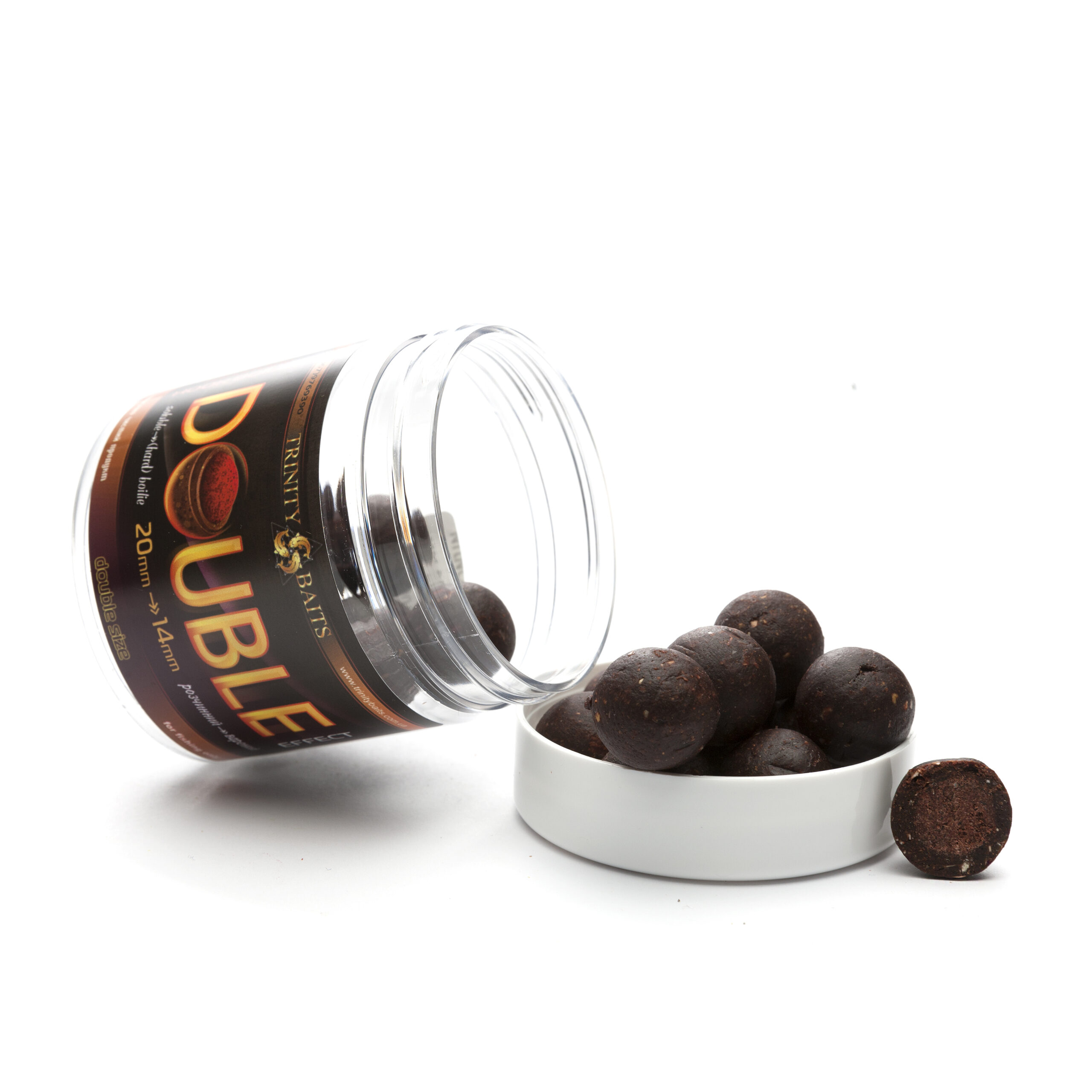 Бойли насадочні DOUBLE складаються з двох частин. В середині варений 14мм., який рівномірно обгорнутий розчинним до 20мм. Накатані на фірмовому міксі від Trinity Baits. Збалансований склад неодноразово доповнений і покращений. Бойли мають м’яку структуру, що дозволяє комфортно одягати їх на волосінь. При попаданні у воду починають блискавично подавати харчовий сигнал.
