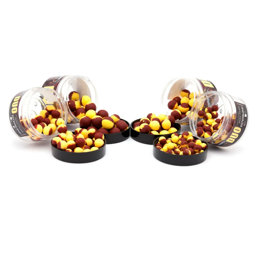 З назви Дуо можна зрозуміти що цей вафтерс складений з 2 частин з’єднаних між собою. Одна частина це яскравий апетитний плавучий поп-ап, а друга частина це ароматний варений бойл. Таке поєднання і створює саме ту ідеальну насадку яка здатна вдало приманити навіть самого вибагливого коропа.