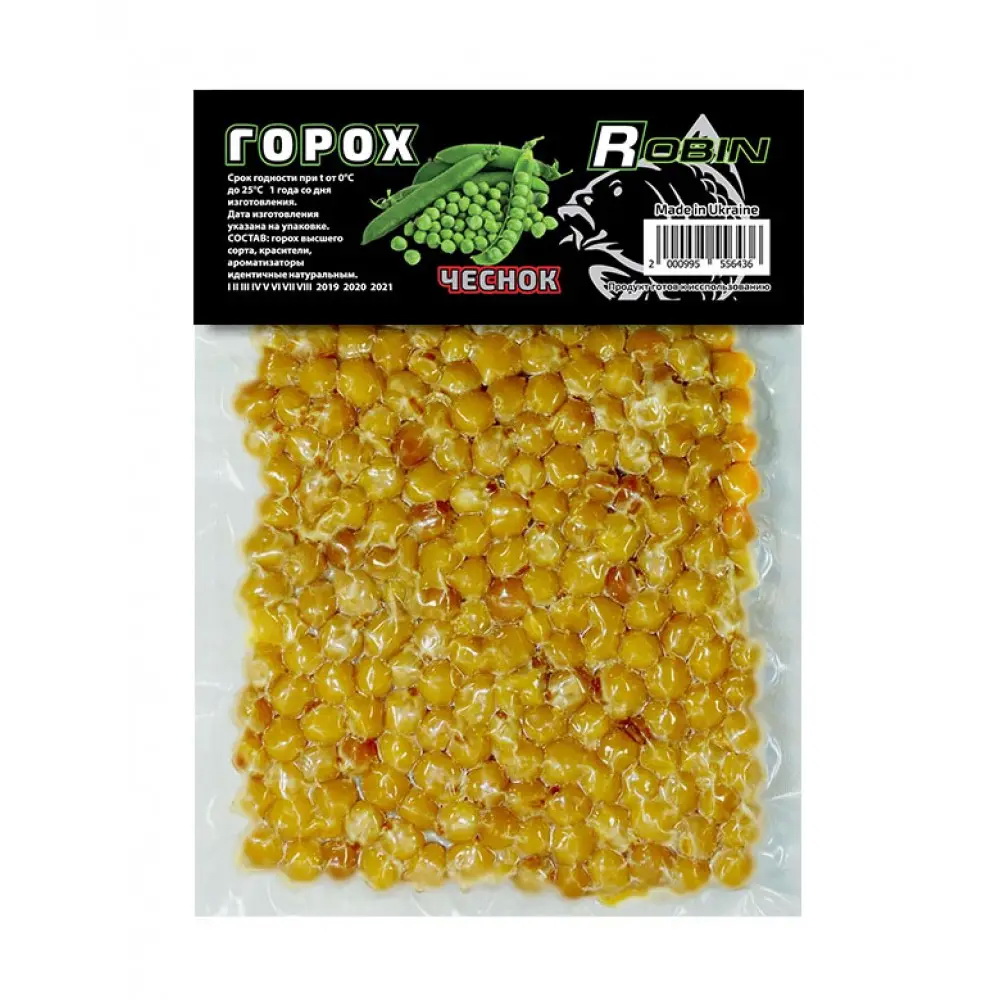 Горох ROBIN вакуум ЧАСНИК – містить ароматизатори, які приваблюють рибу. Може використовуватись для ловлі: коропа, амура, карася, ляща та іншої риби. Ароматні властивості діють як в холодній, так і в теплій воді. При виготовленні насадок “ROBIN” використовуються тільки кращі сорти гороху з натуральними ароматизаторами.
