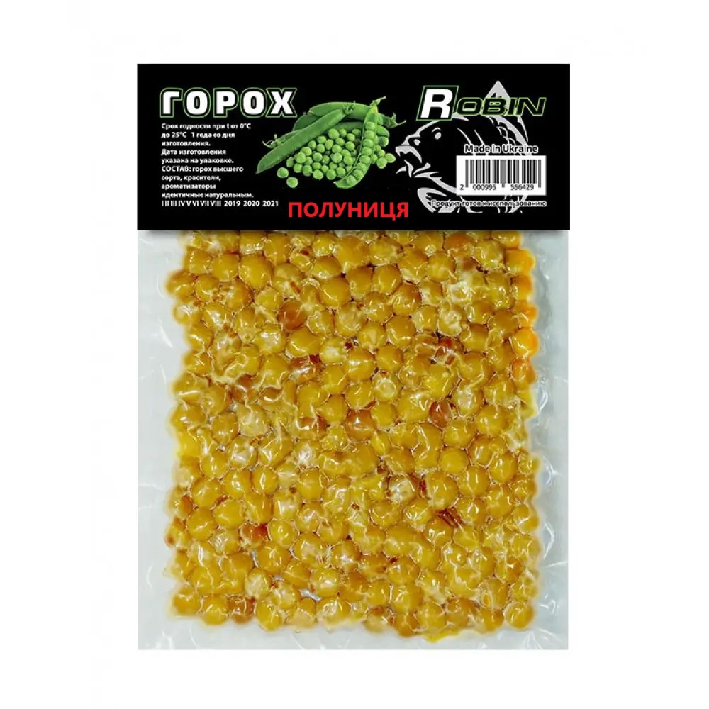 Горох ROBIN вакуум ПОЛУНИЦЯ – містить ароматизатори, які приваблюють рибу. Може використовуватись для ловлі: коропа, амура, карася, ляща та іншої риби. Ароматні властивості діють як в холодній, так і в теплій воді. При виготовленні насадок “ROBIN” використовуються тільки кращі сорти гороху з натуральними ароматизаторами.