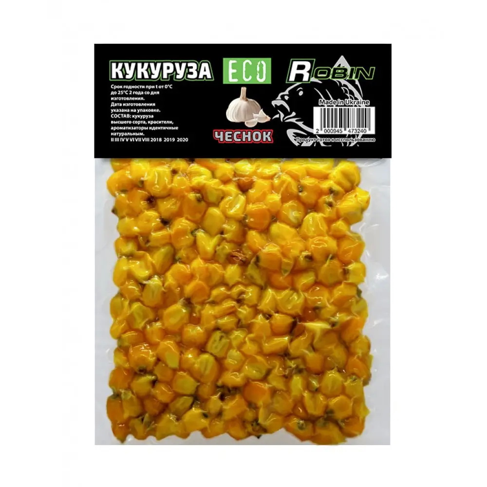 Кукурудза ROBIN ECO вакуум Часник – містить ароматизатори, які приваблюють рибу. Може використовуватись для ловлі: коропа, амура, карася, ляща та іншої риби. Ароматні властивості діють як в холодній, так і в теплій воді. При виготовленні насадок “ROBIN” використовуються тільки кращі сорти кукурудзи з натуральними ароматизаторами.