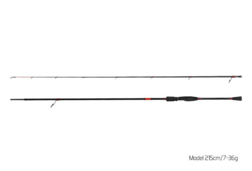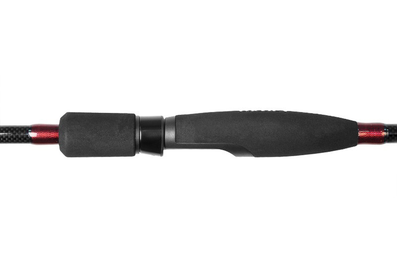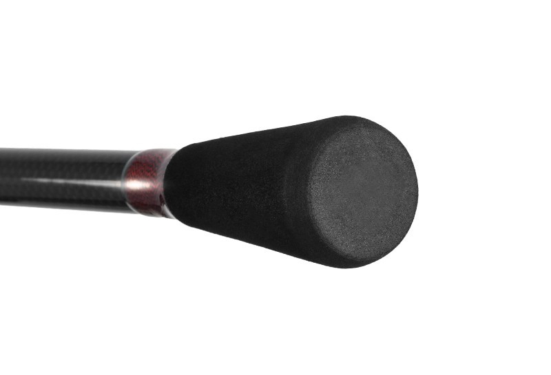 Конус карбонового бланка 24T створює дію “А” з твердим заднім ходом та чутливим кінчиком вудилища. Клювання миттєво передається на ручку вудилища, що забезпечує негайну реакцію та швидке підсікання. Між першими двома кільцями є червона контрастна частина для кращої індикації клювання. Інші частини вудилища виконані в поєднанні криваво-червоного та матово-чорного бланка, що ідеально підкреслює загальний спортивний характер вудилища.